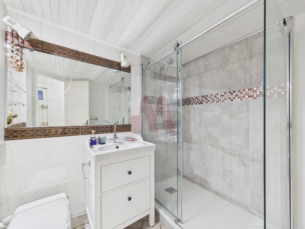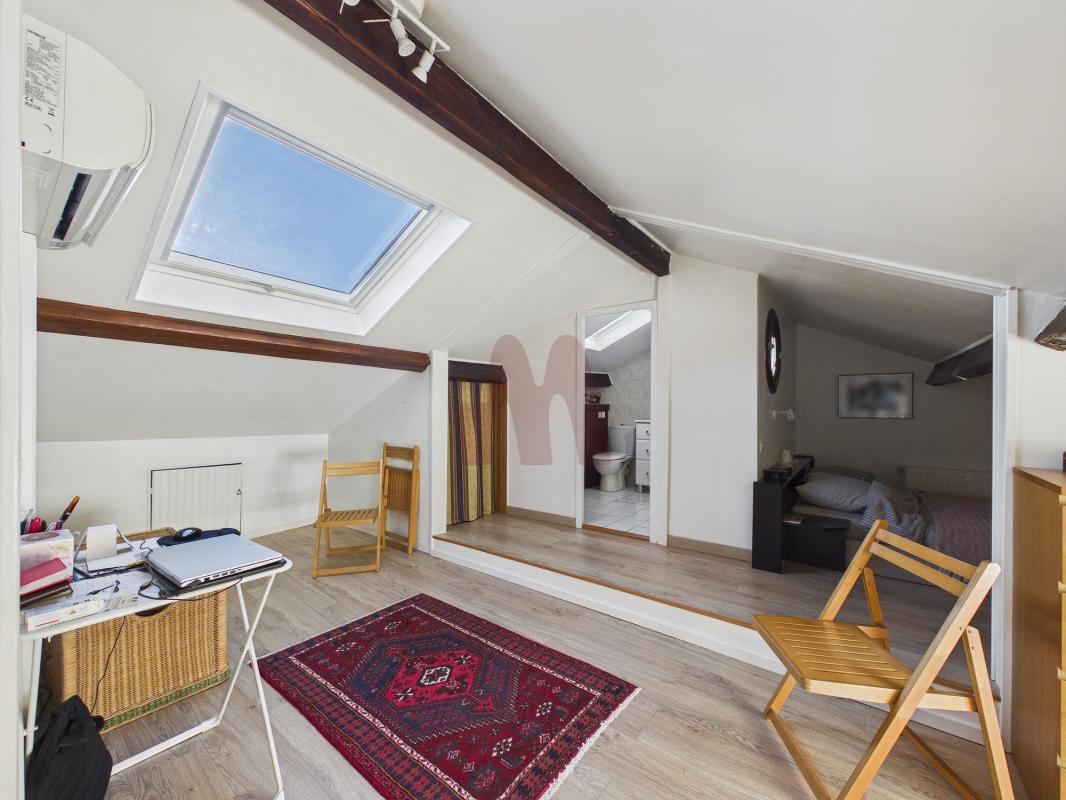 À l'étage, une grande chambre de plus de 20 m² bénéficie de sa salle de douche privative, dans un environnement calme et agréable.